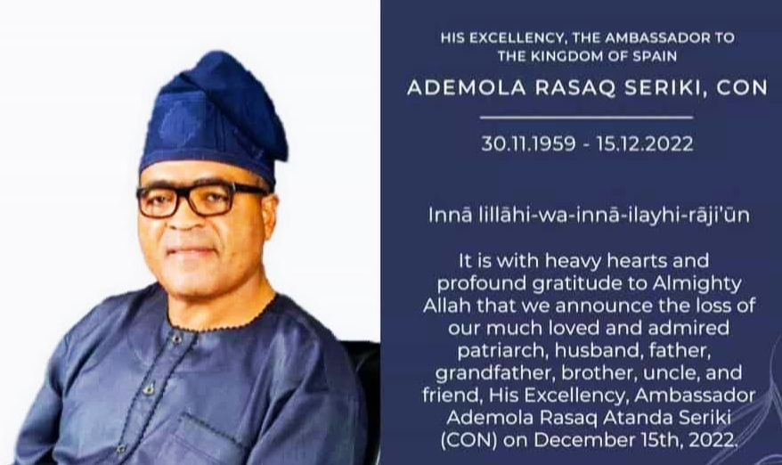 “It is with heavy hearts and profound gratitude to Almighty Allah that we announce the loss of our much loved and admired patriarch, husband, father, grandfather, brother, uncle, and friend, His Excellency, Ambassador Ademola Seriki (CON) on December 15th, 2022, the statement reads.